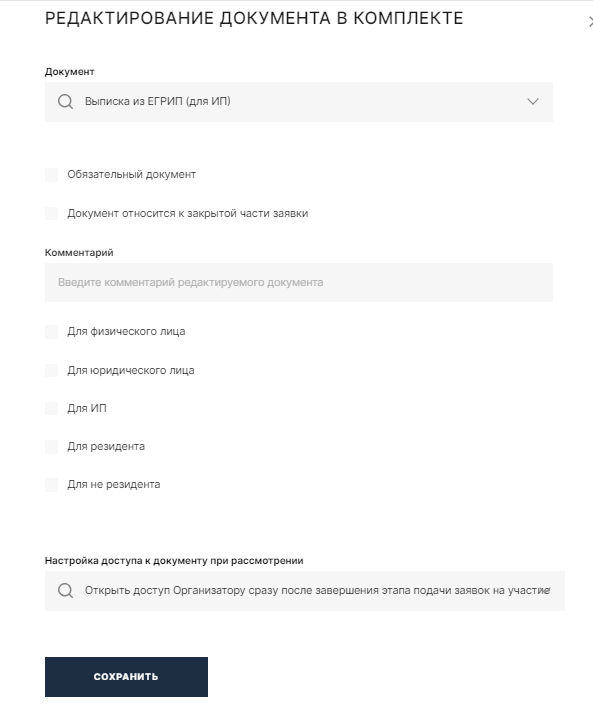 -  создания нового комплекта документов запрашиваемого у претендентов на участие в процедуре,